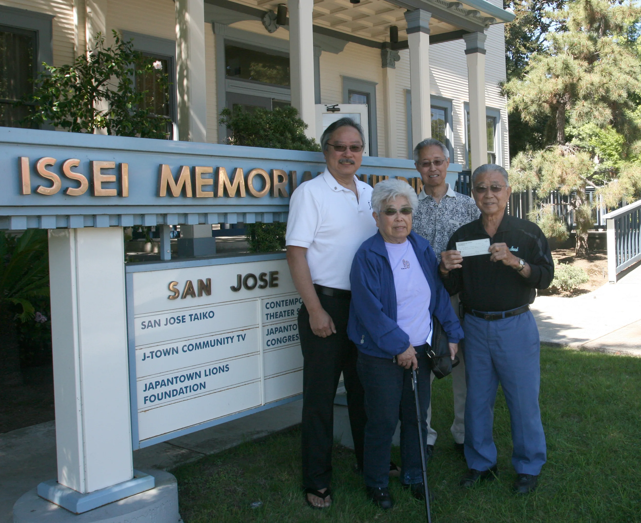 The Matsumotos dropped by the IMB to hand over their donation check. Front row: Lucy Matsumoto and Ray Matsumoto. Back row: Leon Kimura and Tom Oshidari.